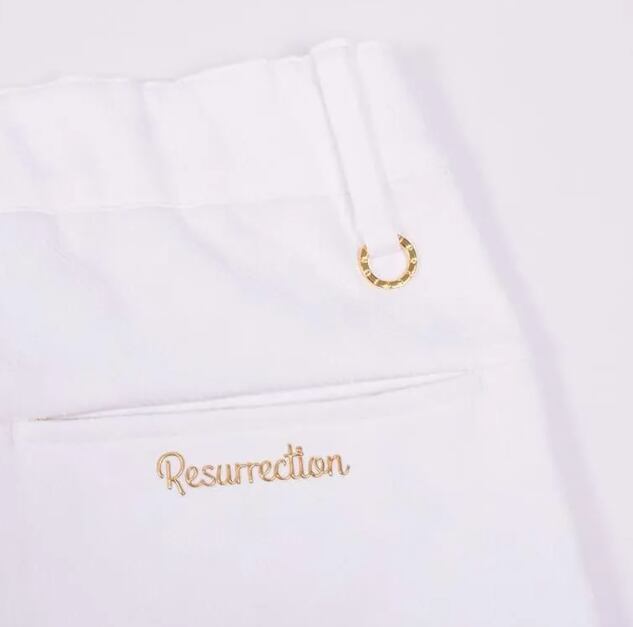 こだわったのは何気ない瞬間に隙間からのぞくオシャレ感。ポケットの内生地や、腰回りの内側にレザレクションの代名詞である幾何学模様をプリント。