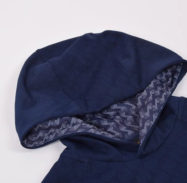 おだやかな気温の頃はトップスの主役として、肌寒い時には上から気兼ねなくアウターを羽織って。通年で袖を通して頂く機会も多いはず。こだわったのは何気ない瞬間に隙間からのぞくオシャレ感。代名詞である幾何学模様は、フードの内側にさりげなくデザインいたしました。