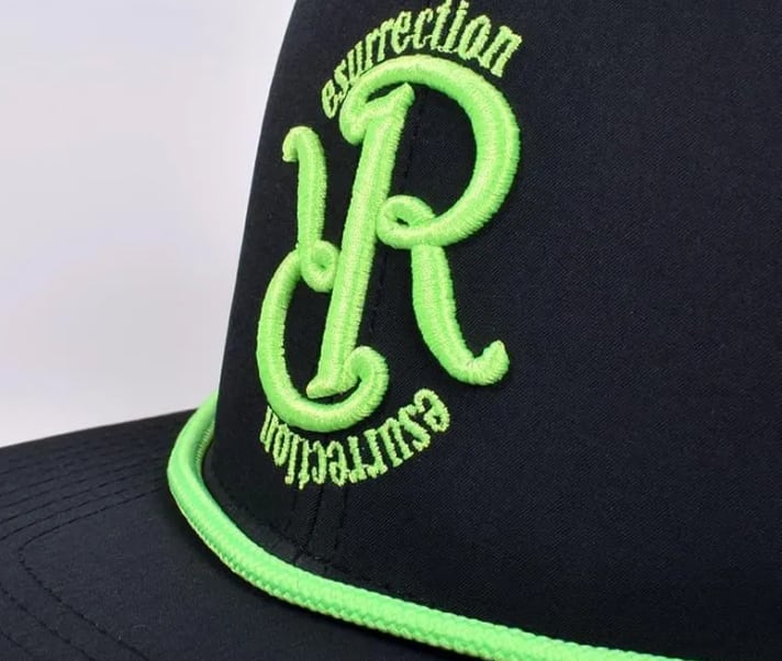 フロントのRRロゴ、そしてツバのアクセントロープにネオンカラーを採用。コーディネートに程よいインパクトを与えながらも、レザレクションらしい品格をしっかりと感じられる仕上がりです。